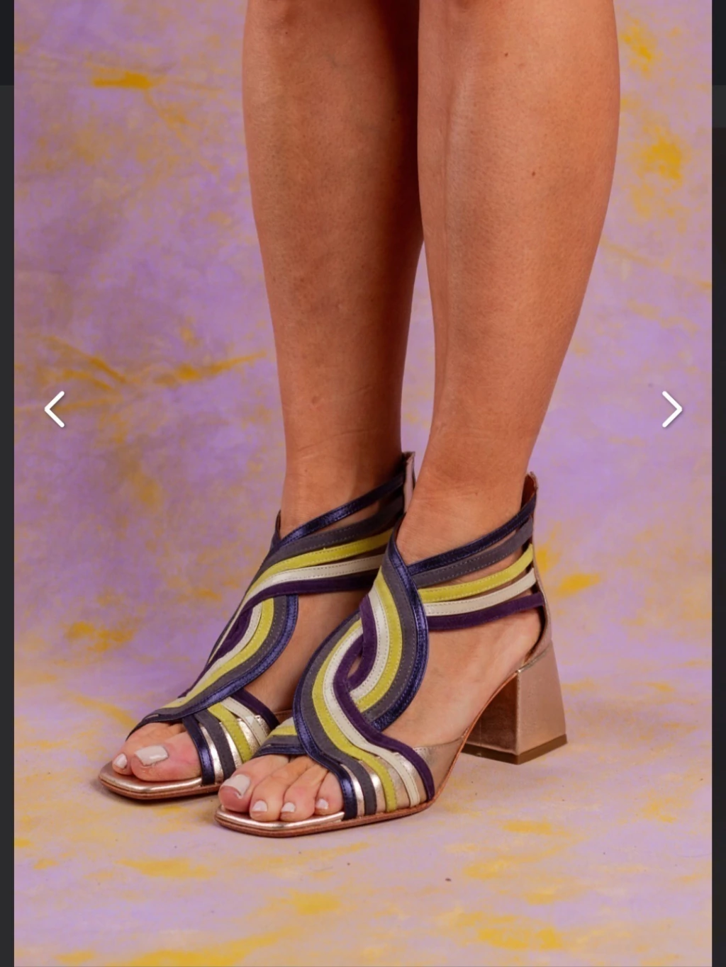 Con tiras cocidas en capellada azul metalizado, cabra gris, cabra Lima, charol Manteca y cabra Violeta.